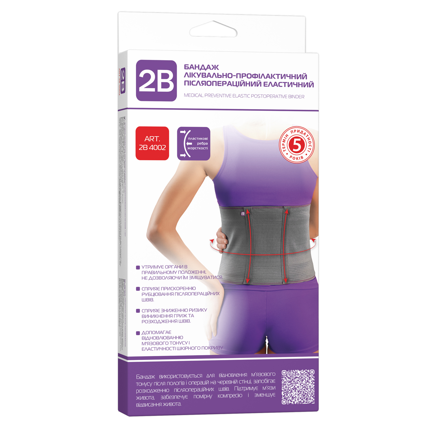 Бандаж лікувально-профілактичний післяопераційний еластичний використовується для відновлення м’язового тонусу після пологів та операцій на черевній стінці, запобігає розходженню післяопераційних швів. Підтримує м’язи живота, забезпечує помірну компресію і зменшує відвисання живота. Знижує больові відчуття за рахунок надійної фіксації. Добре тримає форму за рахунок 2-х ребер жорсткості. Допомагає відновлюванню м'язового тонусу і еластичності шкірного покриву та добре моделює контури тіла.