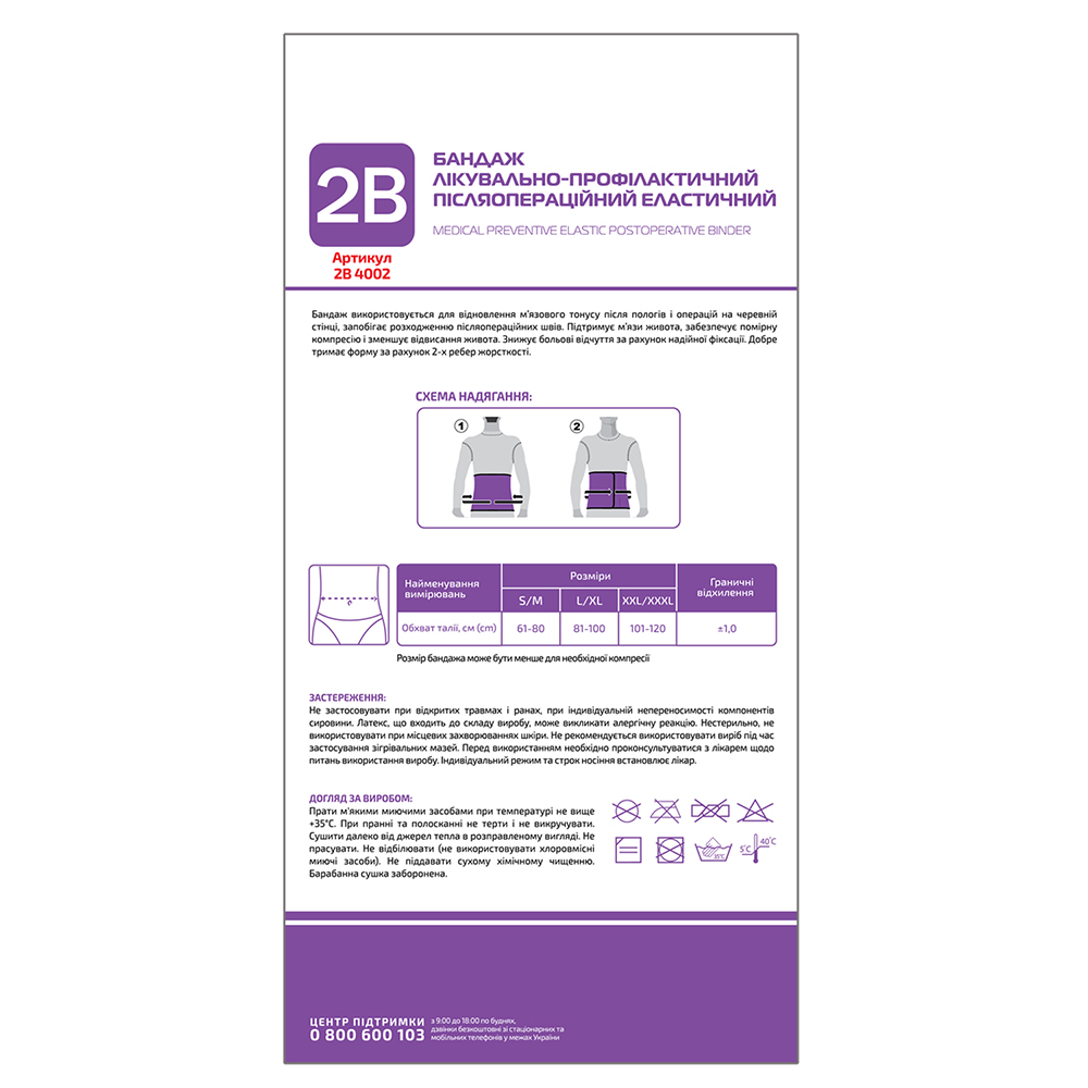 Бандаж лікувально-профілактичний післяопераційний еластичний використовується для відновлення м’язового тонусу після пологів та операцій на черевній стінці, запобігає розходженню післяопераційних швів. Підтримує м’язи живота, забезпечує помірну компресію і зменшує відвисання живота. Знижує больові відчуття за рахунок надійної фіксації. Добре тримає форму за рахунок 2-х ребер жорсткості. Допомагає відновлюванню м'язового тонусу і еластичності шкірного покриву та добре моделює контури тіла.