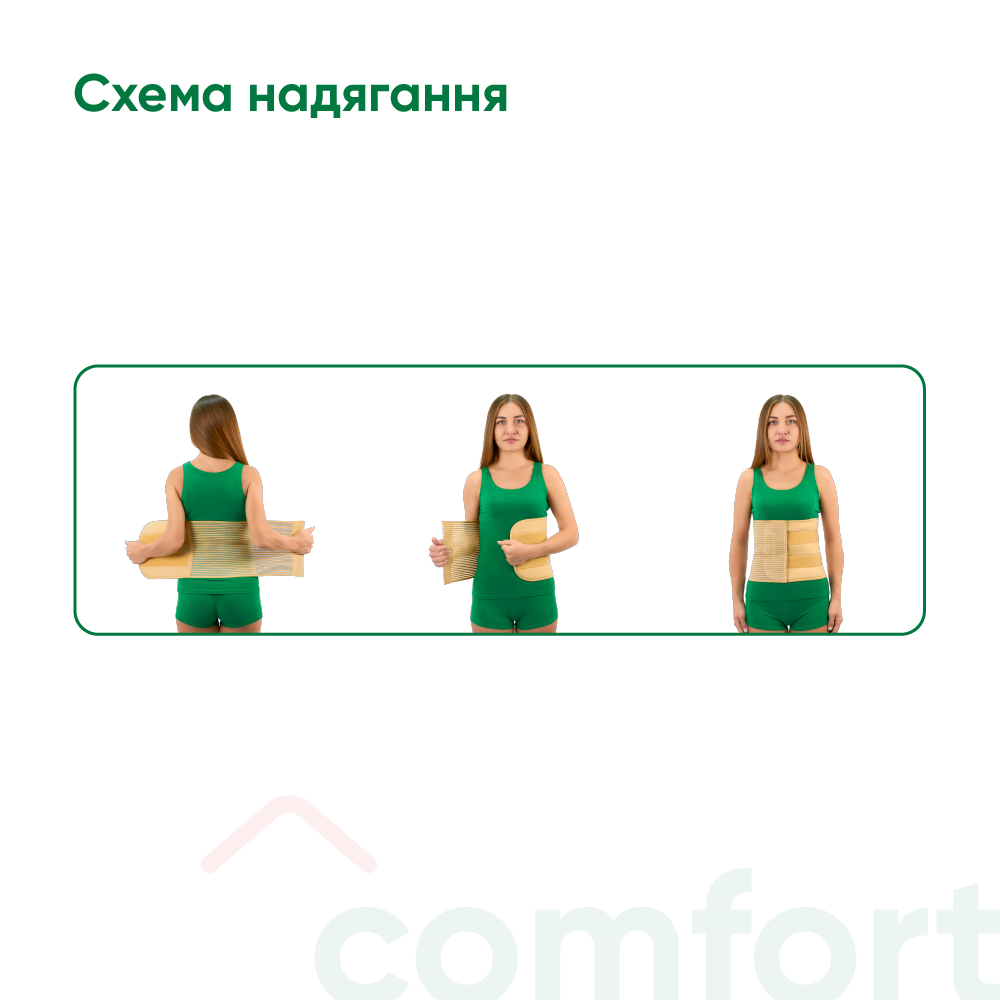 Бандаж універсальний застосовується при: профілактиці розбіжностей післяопераційних швів, утворення післяопераційних гриж, при стані після оперативного втручання на передній черевній стінці у випадках, коли є ознаки слабкості м'язового каркаса черевної стінки (наприклад, надмірна маса тіла, післяопераційний стан у людей похилого віку – після 60 років), при грижах білої лінії живота, у післяпологовий період для прискорення інволюції матки, підтримки м'язів передньої черевної стінки, при необхідності зменшення рухливості грудної клітки після травм та операцій на грудній порожнині та ребрах, після кесаревого розтину, при пупкових грижах у дорослих, як заміна корсетів для моделювання фігури. Бандаж можна застосовувати як зігріваючий для спини (у разі надягання застібкою на спину.