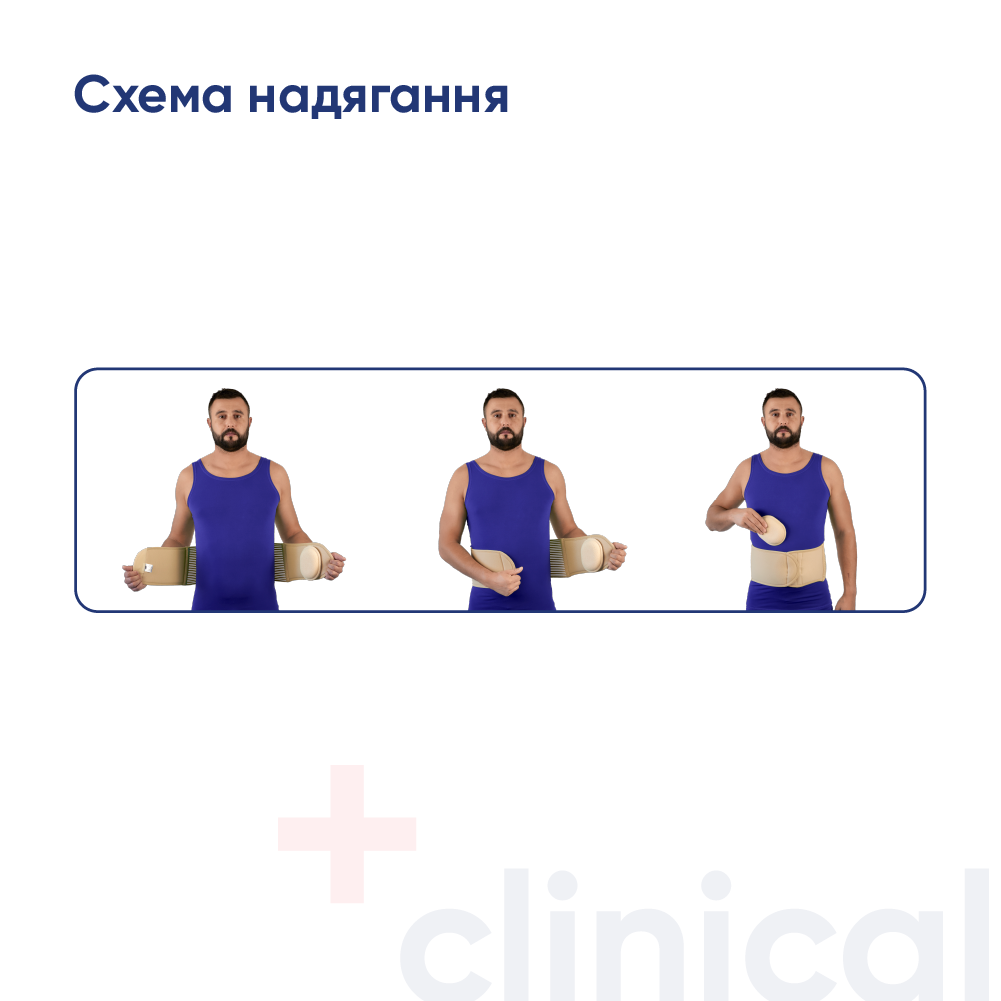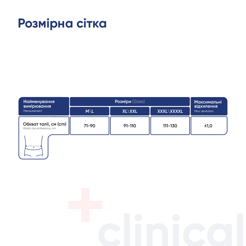 - Широкий крок застібки допомагає затягнути або розслабити виріб залежно від обсягів черевної порожнини пацієнта, а також при зміні обсягів після операції або під час реабілітації (схуднення або набір ваги/об'єму)