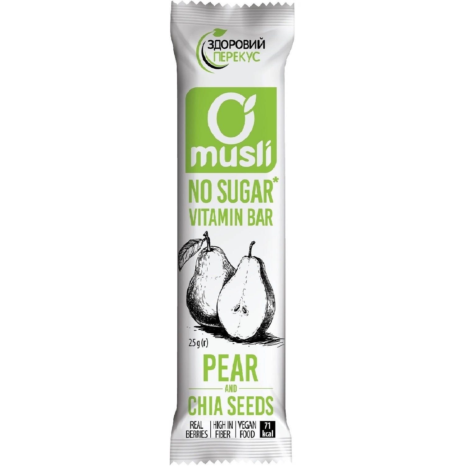 Батончик-мюслі на основі кукурудзяних кульок, вівсяних, ячмінних і пшеничних пластівців, груши та насіння Чіа на подушці з дієтичного шоколаду.