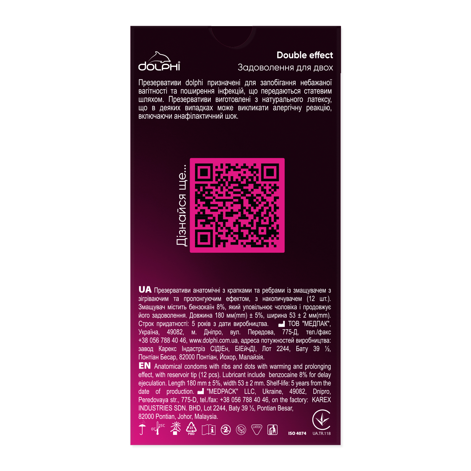 Презервативи Dolphi Double Effect створені для подвійного задоволення. Неймовірно, але це реально! Анестетик всередині Dolphi Double Effect здатний уповільнити еякуляцію та дозволить партнерам не турбуватися про ранній фінал, а розігріваючий гель на текстурованій поверхні презервативів здатний миттєво розігріти тіло жінки, що прискорить отримання феєричного оргазму.