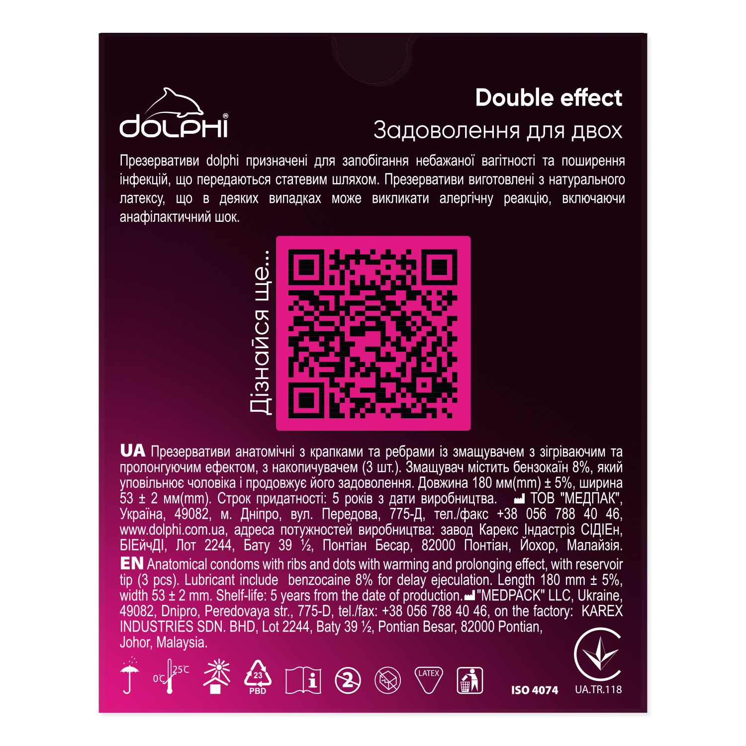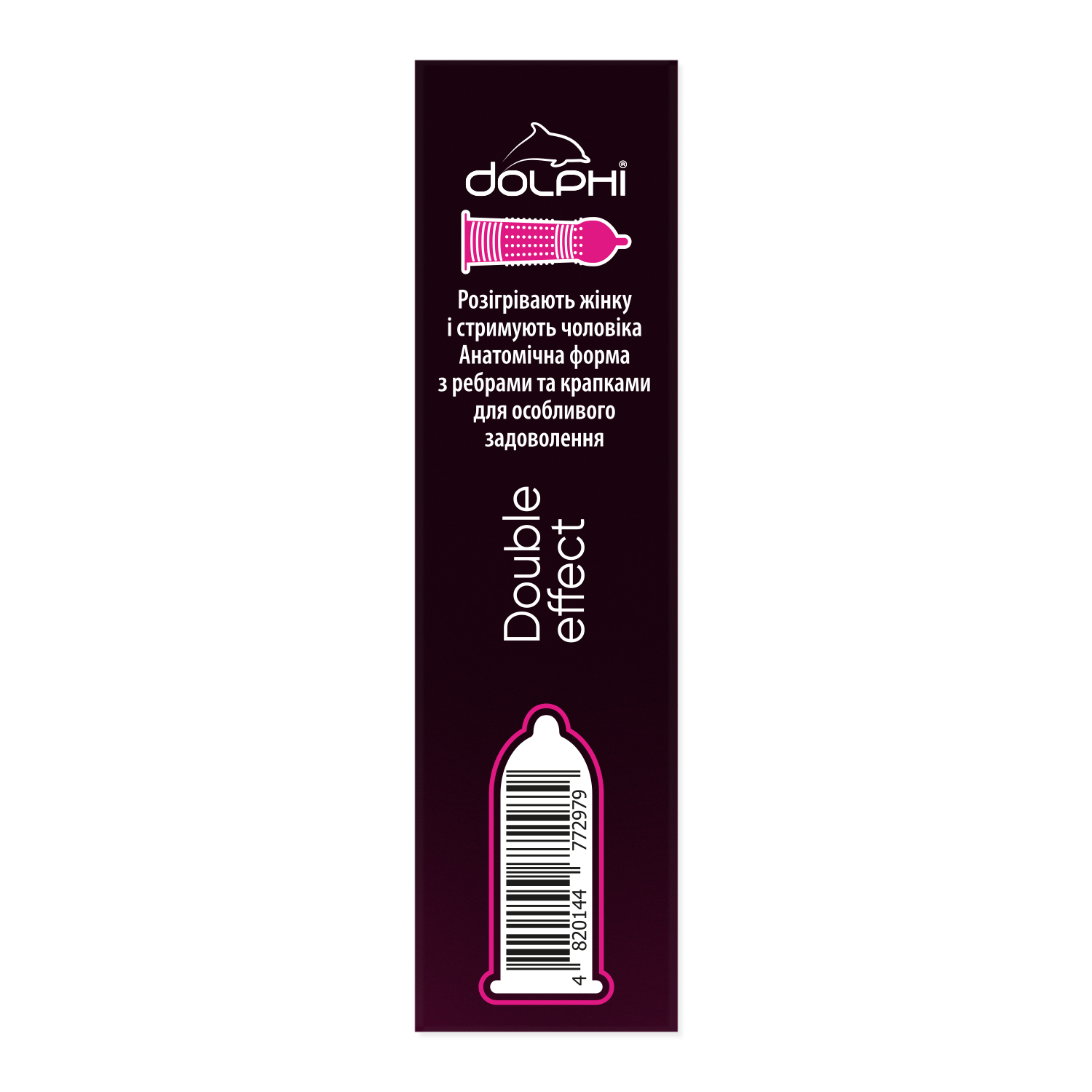 Презервативи Dolphi Double Effect створені для подвійного задоволення. Неймовірно, але це реально! Анестетик всередині Dolphi Double Effect здатний уповільнити еякуляцію та дозволить партнерам не турбуватися про ранній фінал, а розігріваючий гель на текстурованій поверхні презервативів здатний миттєво розігріти тіло жінки, що прискорить отримання феєричного оргазму.