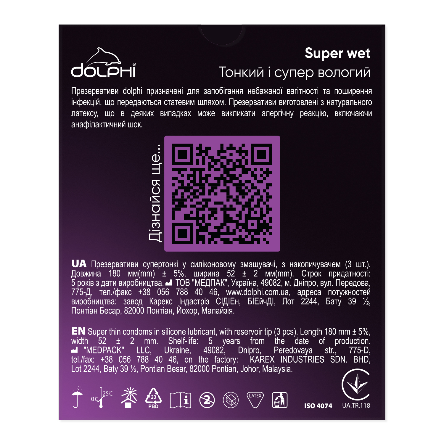Супертонкі та супервологі Dolphi Super Wet подарують відчуття свободи між партнерами. Кожен рух, кожен дотик дозволить випробувати нову гаму задоволення так, наче вас ніщо не розділяє! Завдяки унікальній технології виробництва презервативи Dolphi Super Wet ще більше зволожені ніжною змазкою, рівномірно розподіленою по всій довжині та забезпечує ще більший комфорт та ще більш природні відчуття.