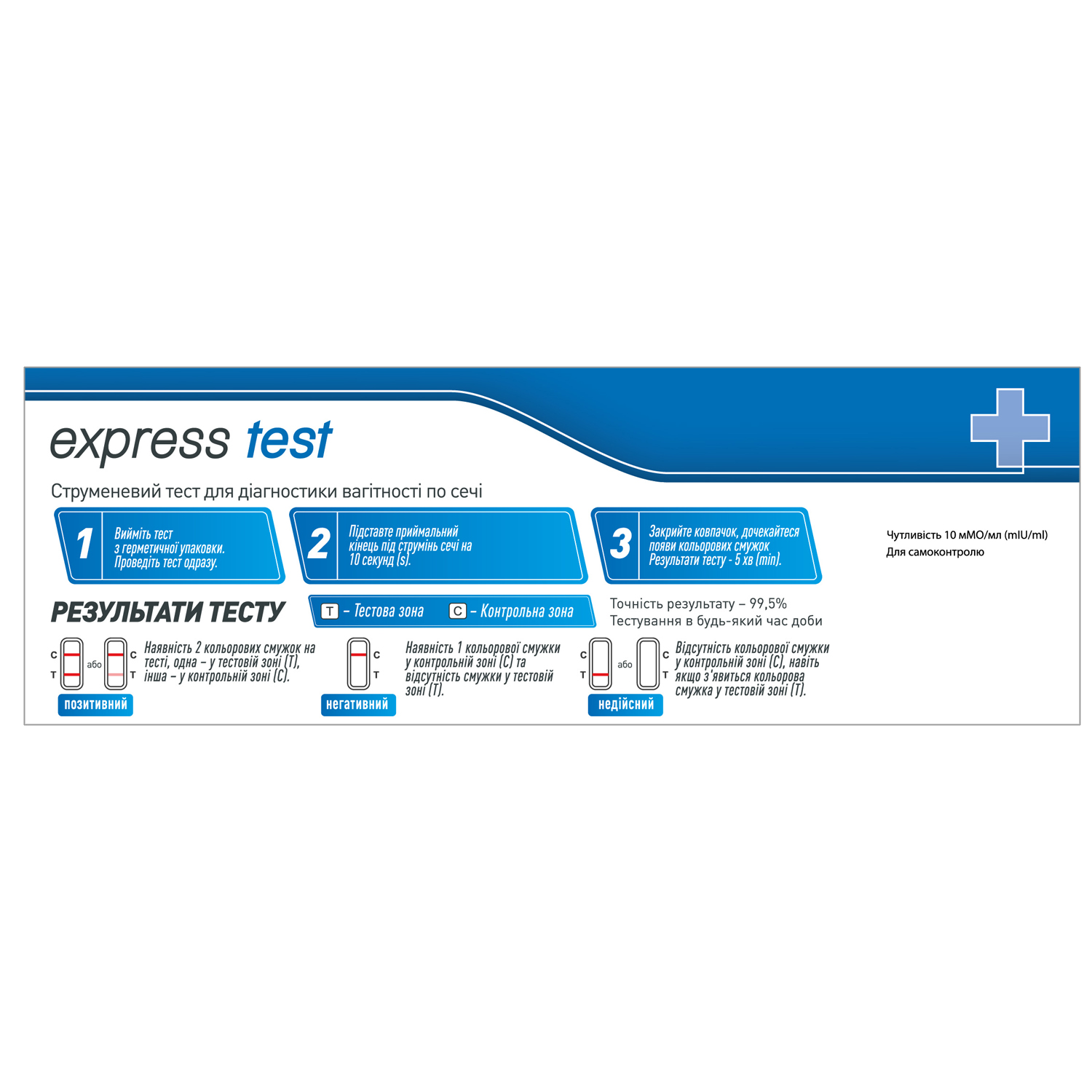 Струменевий тест для ранньої діагностики вагітності Express Test зручний і комфортний у використанні, забезпечує гігієнічність виконання діагностики та точний результат. Носієм реактиву усередині такого тесту є волокнистий стрижень, що складається з канальців, за ними сеча швидко піднімається до тестової зони приладу де і відбувається хімічна реакція між антитілами та ХГЛ (хоріонічний гонадотропін людини), яка дозволяє кольоровому індикатору змінити колір, таким чином з'являється кольорова смужка.