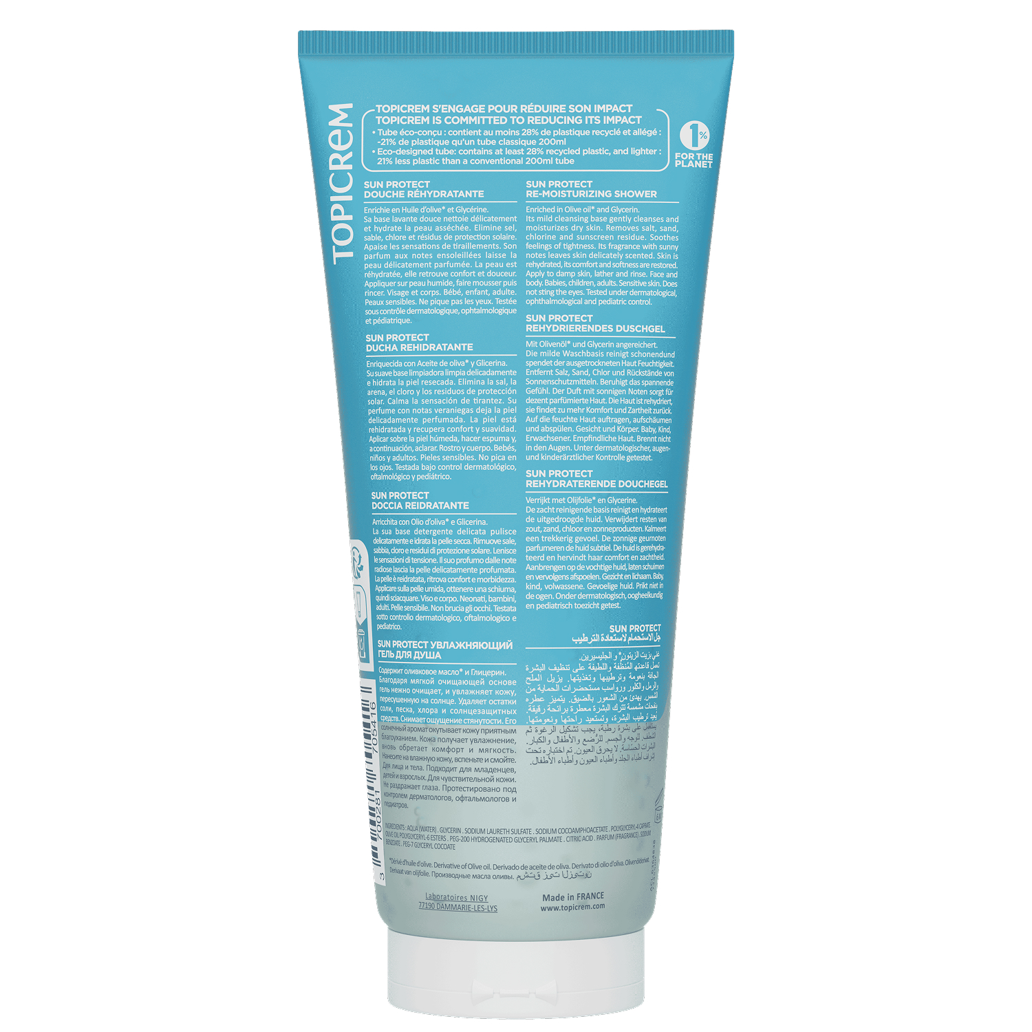 Зволожувальний гель для душу після засмаги делікатно очищає, видаляє залишки сонцезахисного крему, сіль, пісок, хлор. Поновлює зволоження виснаженої сонцем шкіри щонайменше протягом 8 годин, заспокоює та усуває відчуття стягнутості. Не містить мила, не пересушує шкіру. Містить м’які ПАВ натурального походження, оливкову олію, гліцерин. Перевірено на чутливій шкірі під контролем дерматологів, педіатрів та офтальмологів, не подразнює очі.