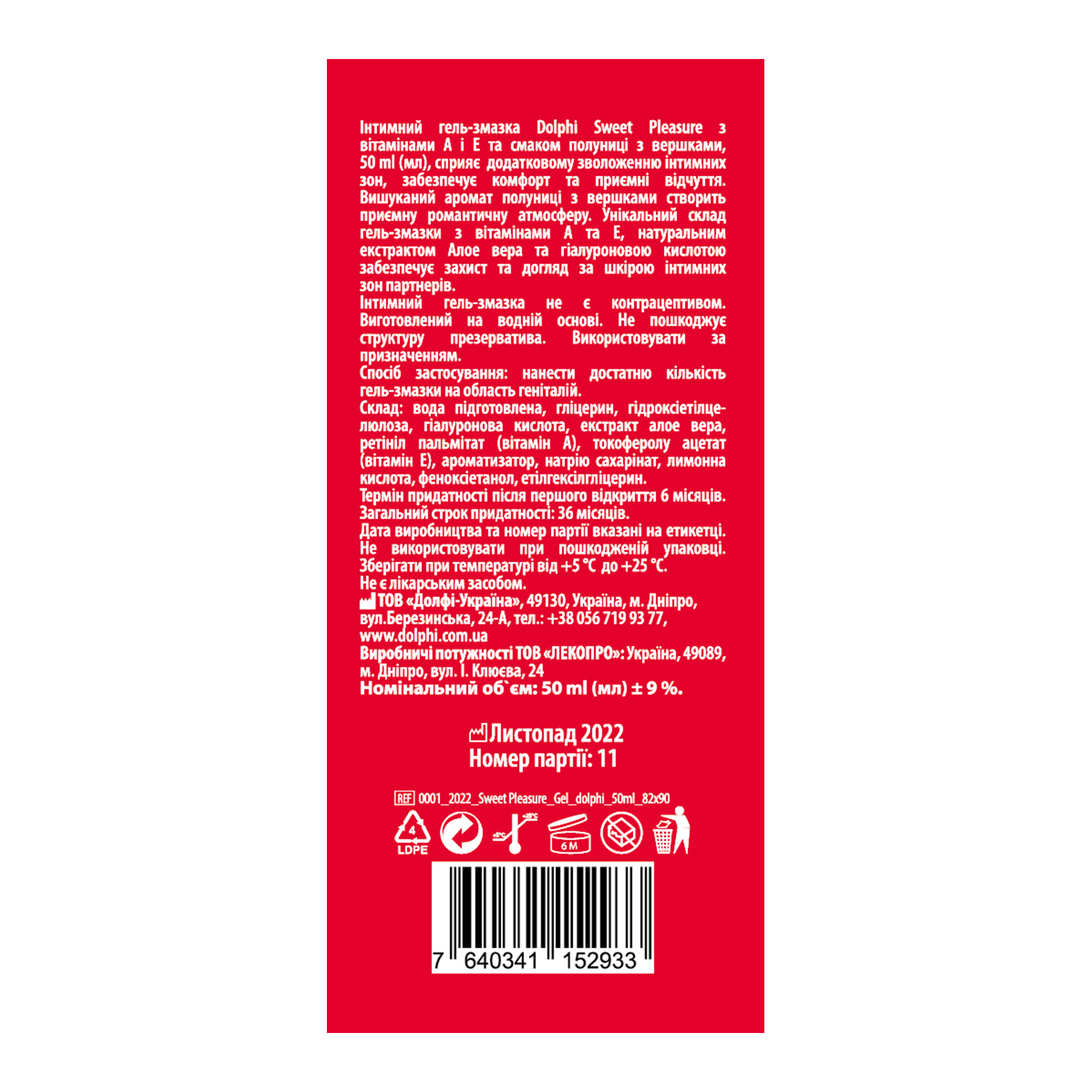 Dolphi Sweet Pleasure має унікальний аромат полуниці з вершками, який не лише додає романтичного настрою партнерам, але й дуже приємний на смак, а особлива формула гель–змазки забезпечує оптимальний рівень PH.