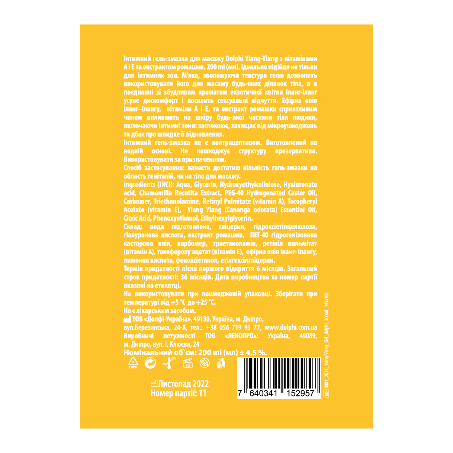 Інтимний гель-змазка для масажу Dolphi Ylang-Ylang з вітамінами А і Е та екстрактом ромашки ідеально підійде не тільки для інтимних зон. М'яка, зволожуюча текстура гелю дозволить використовувати його і для масажу будь-яких ділянок тіла, а в поєднанні зі збудливим ароматом екзотичної квітки Іланг-іланг усуне дискомфорт і посилить сексуальні відчуття. Ефірна олія іланг–ілангу, вітаміни А і Е, та екстракт ромашки сприятливим чином впливають на шкіру будь-якої частини тіла людини, включаючи інтимні зони: заспокоює, захищає від мікроушкоджень та дбає про швидке її відновлення.