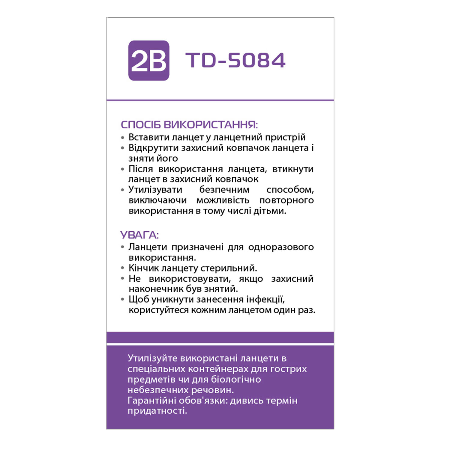 Стерильні одноразові ланцети 2В використовуються для забору крові в домашніх умовах з метою подальшого моніторингу здоров'я. За допомогою ланцетів, всього одним проколом, можна зібрати достатню кількість крові для визначення рівня вмісту в ній глюкози.