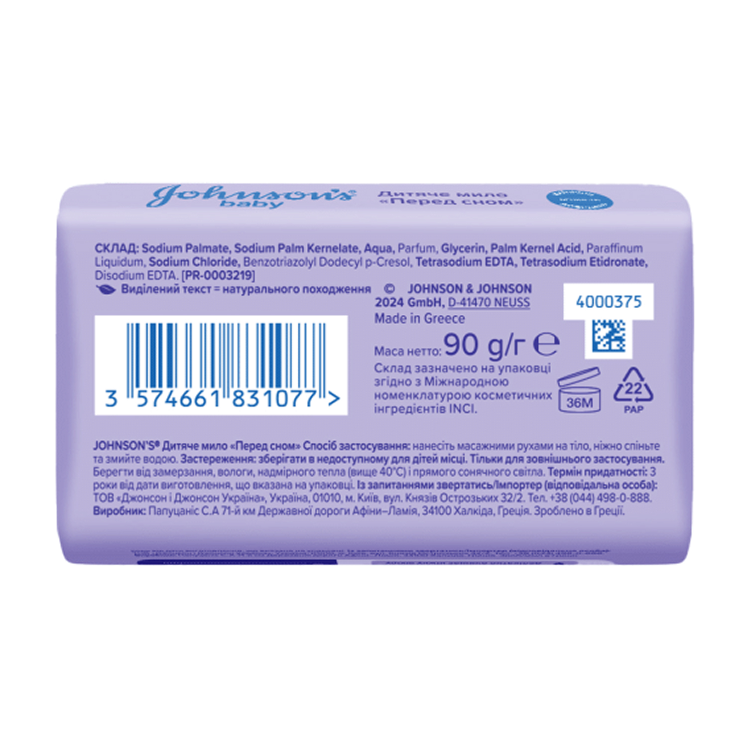 Шкіра немовлят ще не до кінця сформувалася і швидко втрачає вологу. Ось чому Дитяче мило JOHNSON'S Baby «Перед сном» містить ніжні пом'якшувальні і зволожуючі компоненти, які допомагають зберегти дитячу шкіру м'якою.