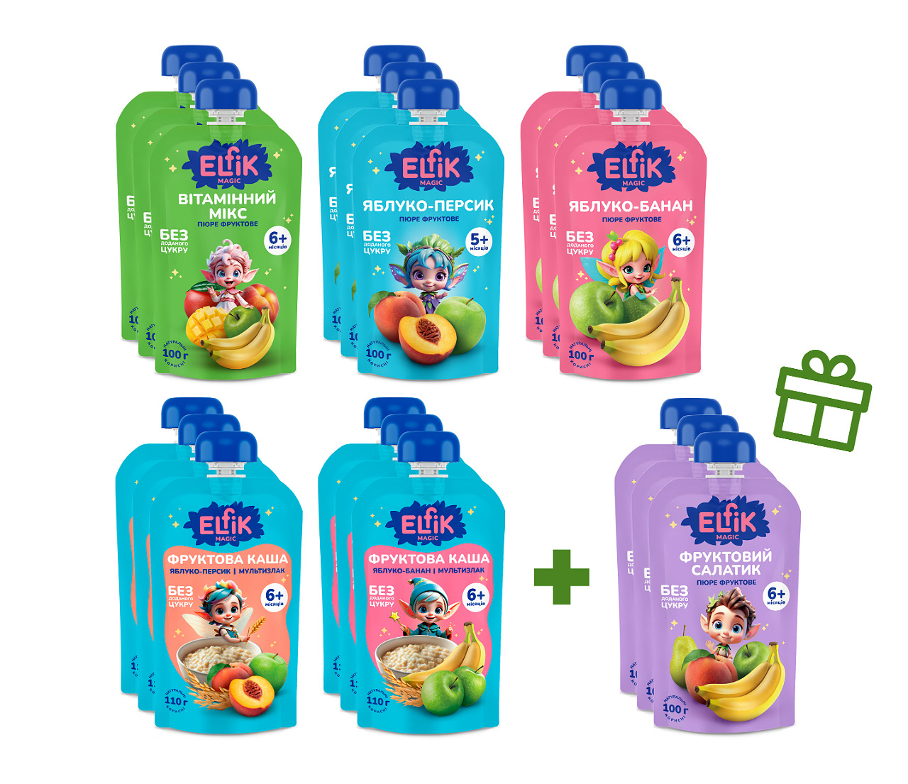 3 шт - Фруктова каша Elfik Magic Вітамінний мікс з яблук, мультизлакової каші, персиків, бананів та манго без цукру для дитячого харчування, гомогенізоване, стерилізоване.