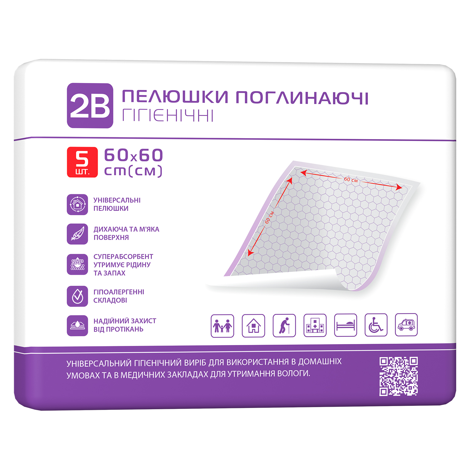 Завдяки своїм характеристикам пелюшки поглинаючі гігієнічні ТМ 2В можуть застосовуватися при догляді за лежачими хворими людьми, що страждають нетриманням, як захист від забруднень постільної білизни або у використанні для інвалідних візків, а також використовуються в будь-яких побутових умовах, де потрібно обмежити протікання різних рідин.