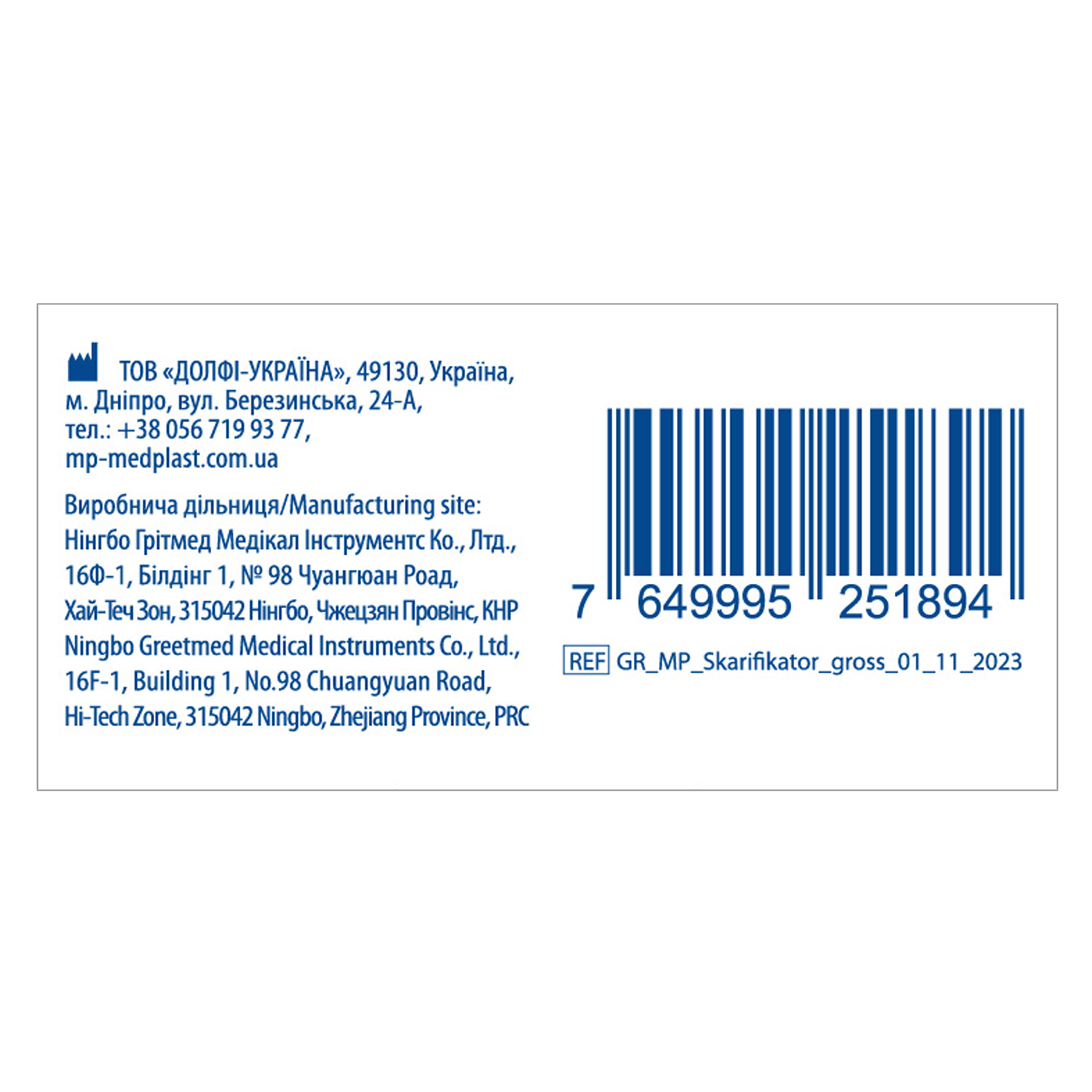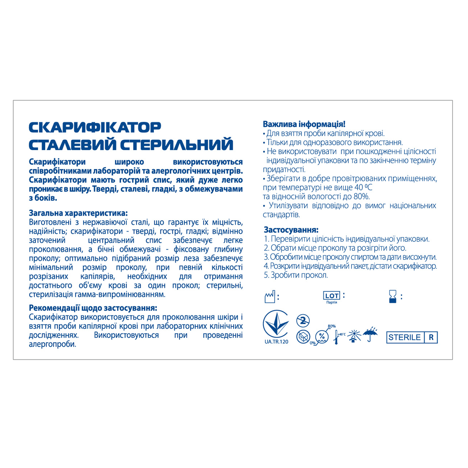 Металевий скарифікатор медичний – це одноразовий медичний інструмент, який використовується для проколювання шкіри пальця для взяття капілярної крові. Він являє собою пластинку з нержавіючої сталі з центральним гострим зубцем у вигляді списа. Металевий скарифікатор медичний є одноразовим інструментом, який використовується лише один раз. Це запобігає поширенню інфекцій.