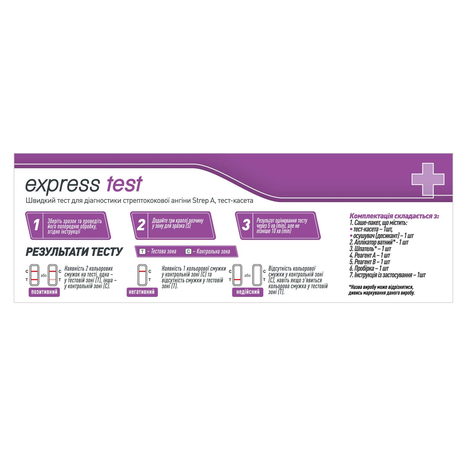 Швидкий тест для діагностики стрептококової ангіни Strep A Express Test, це тест-касета швидкого хроматографічного імуноаналізу для якісного виявлення антигену стрептокока А в зразках мазків із горла, що допомагає в діагностиці стрептококової інфекції групи А.