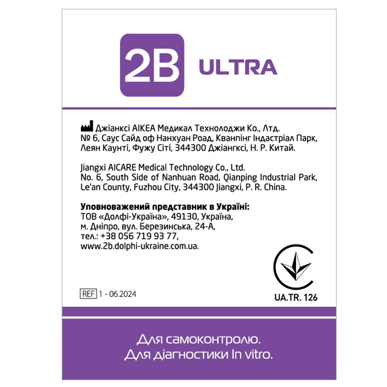 Одноразові тест-смужки 2В ULTRA призначені для використання з глюкометром моделі ULTRA. Вони дозволяють точно вимірювати рівень глюкози в крові, як в домашніх умовах, так і в медичних установах під наглядом лікарів. Для аналізу можна використовувати свіжу цільну кров з пальця або інших ділянок тіла, таких як долоня, передпліччя або плече. Значення рівня глюкози, отримані за допомогою тест-смужок ULTRA, відповідають результатам вимірювань по плазмі крові і відображаються в мілімолях на літр mmol/L (ммоль/л) або в міліграмах на децилітр mg/dl (мг/дл).